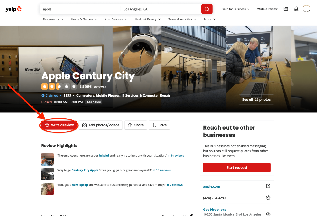 Once the business page opens, look for the red ⭐️ “Write a Review” button.