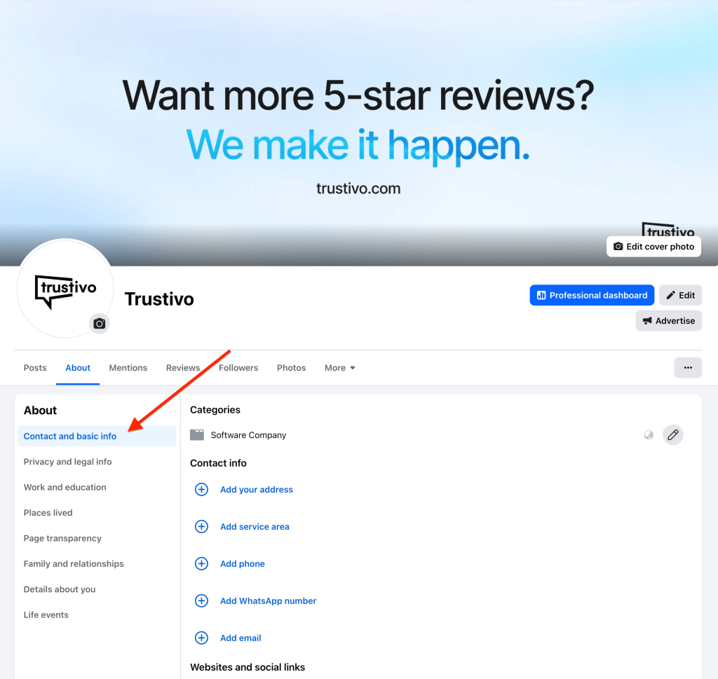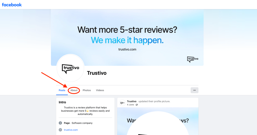 - Go to your Facebook business page and click on the “About” tab