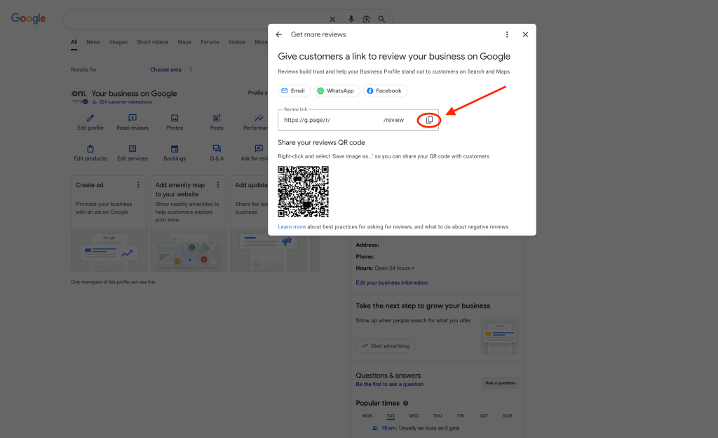 - The pop up will show your review link and also your QR code that you can share. Copy your review link by clicking the copy button to the right side of the link.