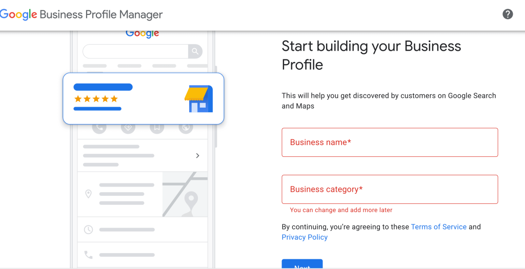 - When creating your Google Business Profile, you will be guided through the setup steps. It usually starts with inputting your business name and choosing a category it best fits into.